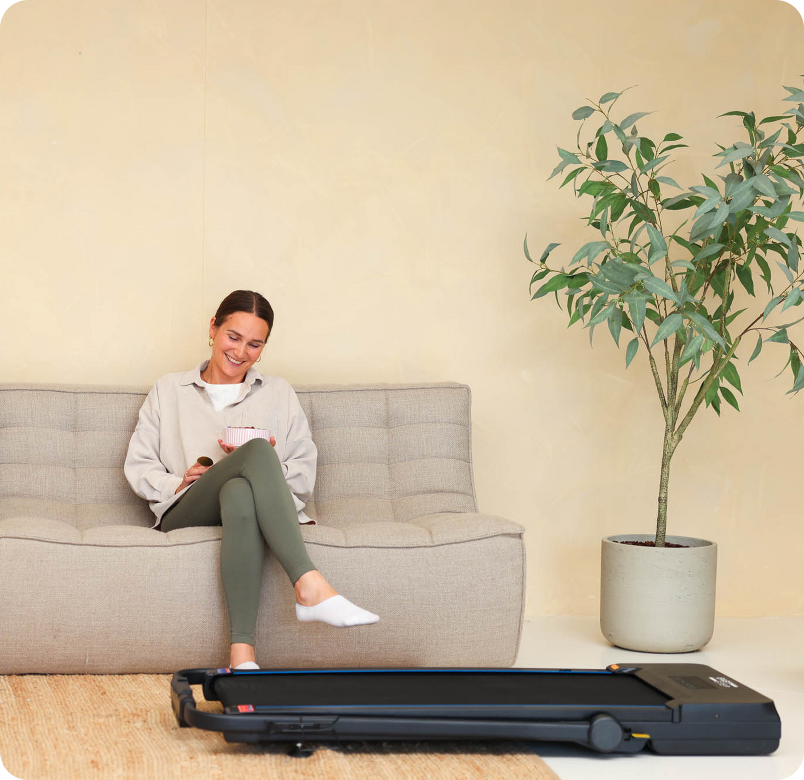 Apartment-safe with our included mat. 1–10 km/h. Foldable. Under-desk.
