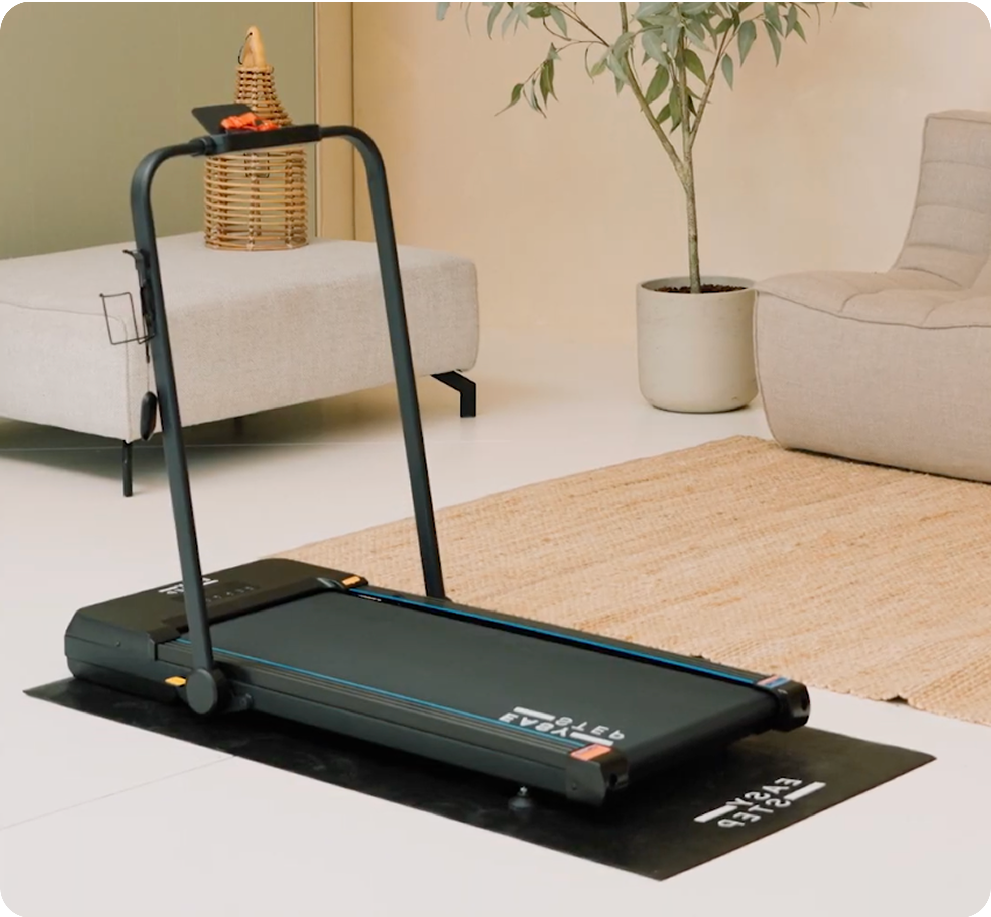 Apartment-safe with our included mat. 1–10 km/h. Foldable. Under-desk.